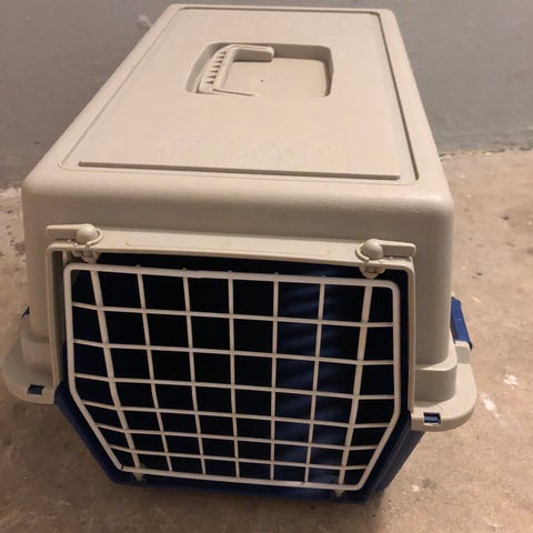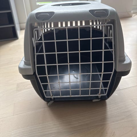 Transportkasse til kæledyr i hård plast i grå og blå farve. Kassen har metalgitre i sider og front for ventilation samt låge i toppen, der kan åbnes for nem adgang til dyret. Egnet til transport af mindre hunde eller katte i bil eller til kortere ture. Kassen har bærehåndtag på toppen og lukkes med plastlåse i siderne.