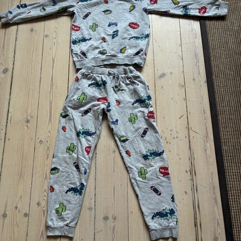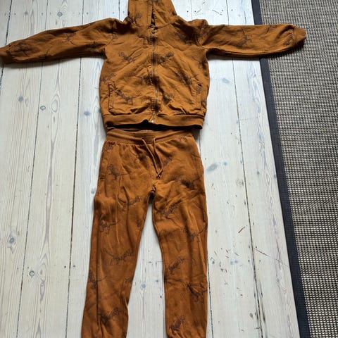 VRS joggingsæt med dinosaurer str. 134. Sættet består af en langærmet sweatshirt og et par bukser med justerbar talje og ribkant ved anklerne. Begge dele er i mørk bundfarve med multifarvet dinosaurprint. Unisex-model egnet til både drenge og piger.