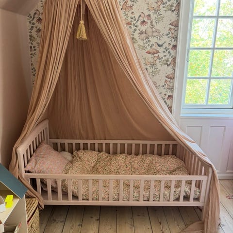 Juniorseng i træ med husramme. Sengen har tremmer langs siderne og er egnet til mindre børn, der er vokset ud af tremmesengen. Trækonstruktionen giver mulighed for at hænge let pynt eller lys op på rammen. Velegnet som overgangsseng på børneværelset.