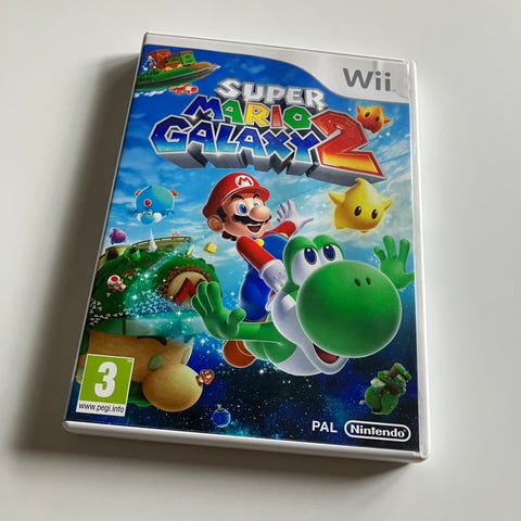 Nintendo Super Mario Galaxy 2 spil til Nintendo Wii. Fysisk udgave på disk i originalt cover med trykt omslag. Spillet er PAL-version med aldersmærkning 3+. Genre: platformspil i Super Mario-serien, hvor man spiller som Mario i forskellige galaksebaner. Velegnet til brug på europæiske Nintendo Wii-konsoller, samt kompatibel med Wii-funktionalitet på visse senere Nintendo-konsoller, der understøtter Wii-spil.