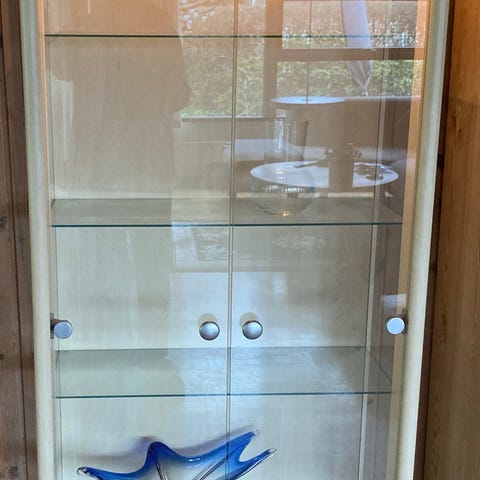 Reol m. Glashylder og 2 skuffer og lys. 1000 kr. Stk