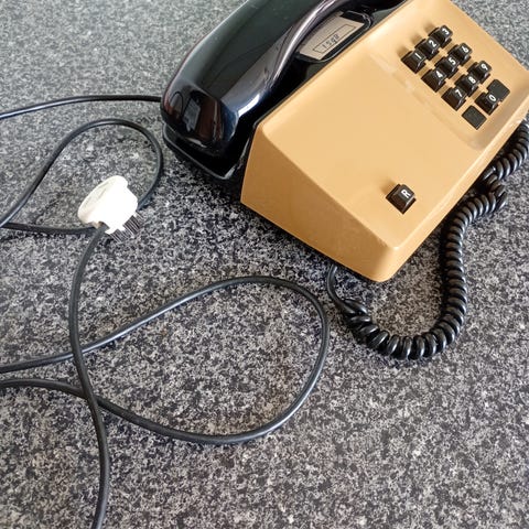 Creme hvid danMark 2 telefon med fast-dail panel.