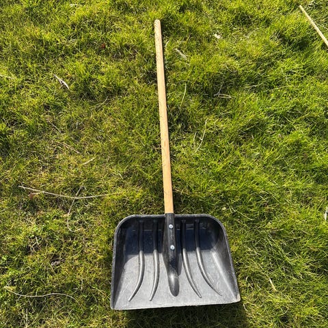 Sneplov på hjul i metal med håndtag og to luftgummihjul. Ploven har bredt skær i metal, egnet til at skubbe og rydde sne fra indkørsler, fortove og andre plane underlag. Konstruktionen gør det muligt at skubbe sneen foran sig uden brug af motoriseret køretøj.