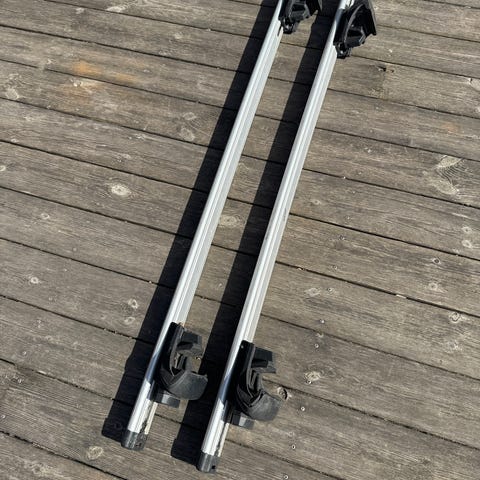 Thule tagbøjler, har siddet på en VW Caddy, men passer sikker også på andre modeller, 122 cm lange, kan justeres i bredden så de passer til forskellige bil modeller. Tagbøjlerne er velegnede som base til montering af fx tagbokse, cykelholdere eller andet tagbagageudstyr, afhængigt af bilmodel og kompatible monteringskit. Konstruktionen er i metal med plastkomponenter omkring fødder og justeringsgreb. - Se også mine andre annoncer med ting til VW Caddy.