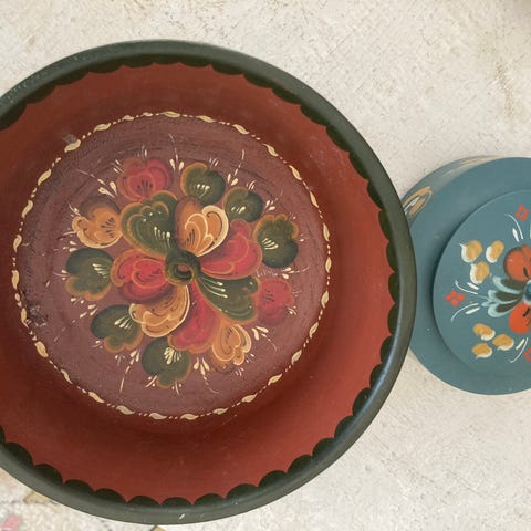 dekorationsfade i keramik med flerfarvet, håndmalet mønster. Sættet består af to runde fade/tallerkener med forskellige ornamenterede dekorationer i klare farver. Bagsiden viser ophængsløsning på det ene fad, så de kan bruges som vægdekoration. køkken, stue eller andre rum, pr stk 40. Tag begge for 75kr