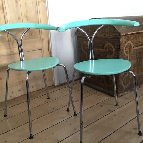 Rigtig flotte blå hammerstole produceret af Fritz Hansen, designet af Arne Jacobsen. Med god fast ryg. Farven er utrolig fin, men ville også kunne males da den også har brugsspor. Ben i kromstål med rund profil. Velegnet som spisebordsstol eller ekstra siddeplads i køkken eller opholdsrum.