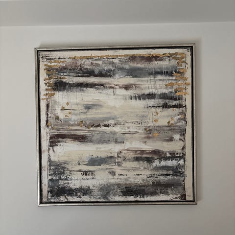 Abstrakt maleri i grå, hvid og guld med sort ramme