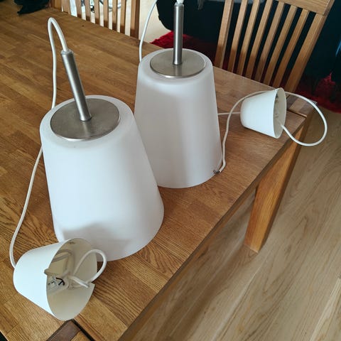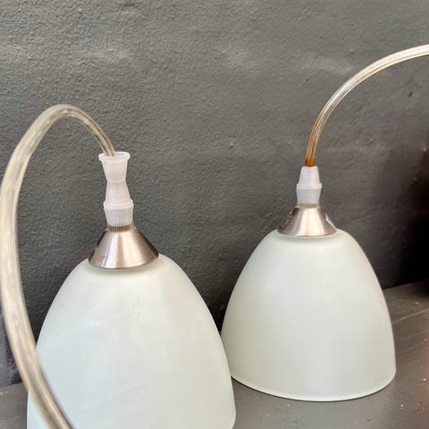 Sælger 2 stk flotte hvide glaslamper Frandsen pendel lamper i opalglas / opal glas med børstet metal top. Loftslamper.