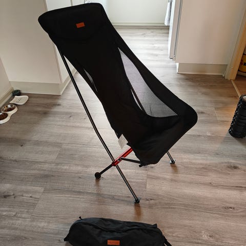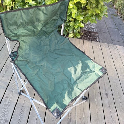 trebenet campingstol i grøn farve. Stolen har trekantet sæde i stof med sorte kanter og ben i metal. Velegnet som let og sammenklappelig siddeplads til camping, fisketure, jagt eller andre udendørsaktiviteter. Leveres med tilhørende pose til opbevaring og transport