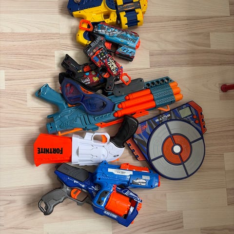 Stor pakke med skumdart våben fra Nerf og X-Shot samt elektronisk skydeskive og mange pile.