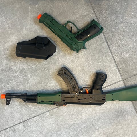 legetøjsgevær i plast med roterende tromle og håndtag til manuel betjening. Geværet er primært grønt med orange og sorte detaljer og bruger skumdartpile. På billederne ses flere grønne skumpile med blå spidser, som medfølger. Egnet som legetøjsvåben til skudleg med skumpile. Bruges udendørs eller indendørs med passende afstand og beskyttelse af øjne efter behov.