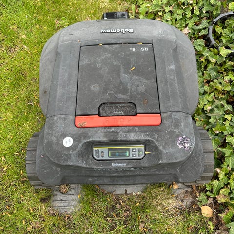 Robomow robotplæneklipper i grøn. Egnet til automatisk klipning af græsplæne. Medfølgende oplader og kontrolenhed fremgår af billedet. Velegnet til brug i have med fastlagt klippeområde, hvor robotten kan programmeres til regelmæssig plæneklipning.
