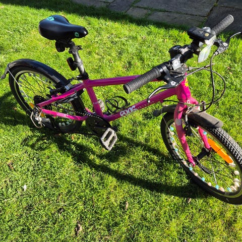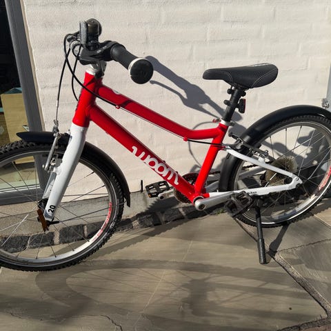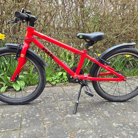 Let børnecykel fra Frog med 20'' hjul. Cyklen er godt brugt og har lidt rust og forskellige mindre skader, som dog ikke påvirker køreegenskaberne. Plastikvindue til geayskifteren mangler, og en del af kædeskærmen er knækket af (se fotos).