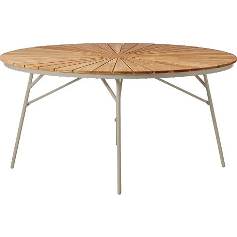 Elegant rundt havebord i moderne retro design, nu i ny beklædning med stel i sandy grey og lamelbordplade i Teak. Perfekt til dig, der elsker træ i lækker kvalitet, som ikke kræver den store vedligeholdelse. Bordpladen er lagt i et smukt solmønster, og med det slidstærke stel i rustfrit, pulverlakeret aluminium får Kerteminde Teak-bordet et klassisk, eksklusivt look. Et smukt bord til dig, der ønsker rene linjer og plads til 6 siddende gæster i haven eller på terrassen.