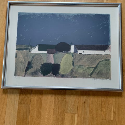 Litografi af Jack Kampmann “DIMMA” 30/60 ,25-30 cm, med ramme 43-40 cm .Billedkunst grafisk tryk med motiv af huse i et mørkt landskab. Trykket viser en række huse i forskellige farver og former, placeret tæt sammen i forgrunden med en mørk himmel bagved. Værket er indrammet i en enkel, lys ramme med passepartout. Egnet til ophængning i stue, kontor eller andre opholdsrum, hvor man ønsker et roligt og stiliseret hus- og landskabsmotiv på væggen.