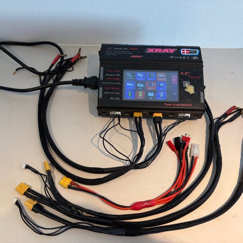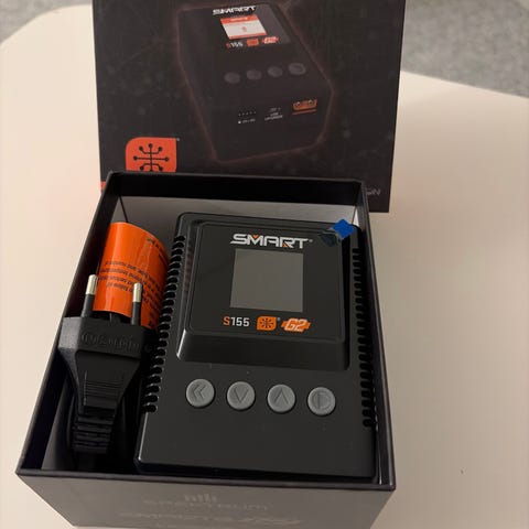 Hyperion 720i duo lader indbygget i plastkasse med prof 24 volts strømforsyning.