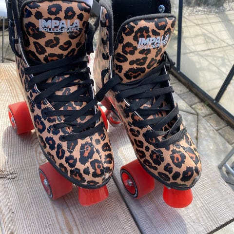 Impala rulleskøjter side by side i str. 41. Klassiske kunstløbsinspirerede rulleskøjter med høj støvle og snørelukning. Flerfarvet pastel design med matchende snørebånd og hjul. Fire hjul pr. støvle monteret på truck/chassis med stopklods foran. Velegnet til rekreativ rulleskøjteløb på glatte underlag som fx asfalt eller indendørs gulve. Købt på onlinekids.dk til 899 kr