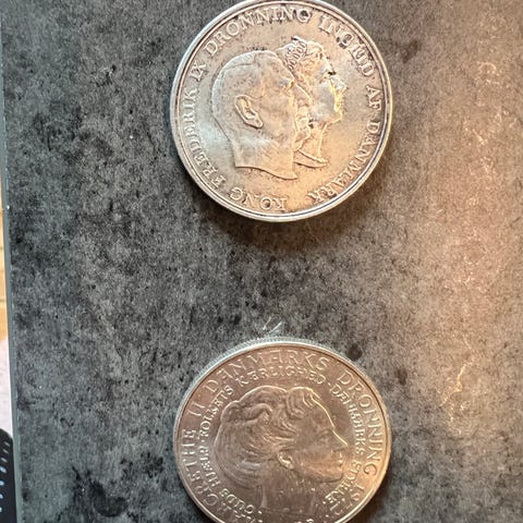 Danmark 2 kroner, 1953, Grønlandsindsamlingen, motiv med kort over Grønland, teksten: kalatdlit nunat, samt prrtrætter af kong Frederik og dronning Ingrid. 2 stks haves sælges helst samlet 400kr.