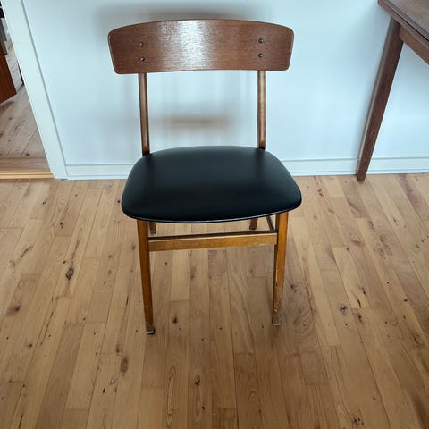 Stolen er i pæn brugt stand. Det ene ben er en smule løst, tænker det kan fixes ??