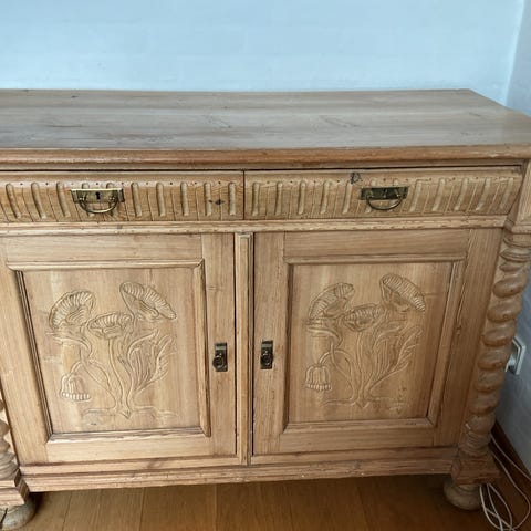 Nymalet i lys olivengrøn. Smukt skab med utrolige udskæringer. Fødderne er udskåret som ørneklør og de oprindelige greb er ligeledes udformet som ørneklør.