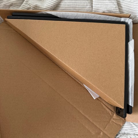Den er ikke pakket ud. Billedet med papkassen er madrassen. Billedet, hvor man kan se en madras, er en tilsvarende madras, vi har beholdt.