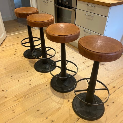 Ægte cognac farvet læder og støbejern to stk skal sælges billigt og hurtigt høj kvalitet fremstår Rene og stærke og funktionelle jeg kan måske hjælpe med levering Giv et bud højde cirka 76 cm diameter ca 34 cm 1200 kr pr stk fst 16 Bowie Barstol