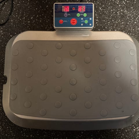 Reviber Plus ER-02 vibrationsplade til træning. Enheden har skridsikker overflade med forhøjede punkter og digitalt kontrolpanel på toppen med display for tid og hastighed samt knapper til start, stop, programvalg og justering af intensitet. Drift ved 240V, 50Hz med en effekt på 300W. Velegnet til hjemmebrug til let træning, afslapning og stimulering af blodcirkulation i ben og fødder.