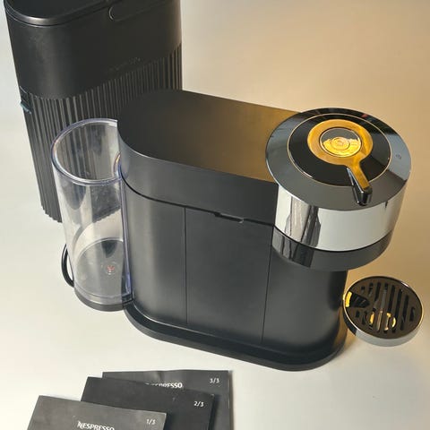 Nespresso Vertuo Creatista espressomaskine. Maskinen er kompatibel med Nespresso Vertuo-kapsler og har integreret mælkeskummer til tilberedning af forskellige kaffedrikke med mælk. Designet omfatter drypbakke, kopstøtte og aftagelige dele, der let kan rengøres.