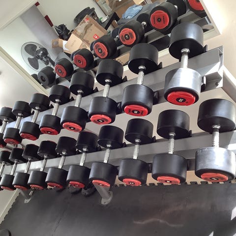 Justerbare håndvægte med stativ. Sættet består af to håndvægte monteret på et gulvstativ. Vægtene kan justeres i flere trin, så belastningen kan tilpasses forskellige øvelser. Velegnet til styrketræning i hjemmet, f.eks. til øvelser for arme, skuldre, bryst og ryg. Stativet holder håndvægtene samlet og i en praktisk arbejdshøjde under træning og opbevaring. Kan justeres fra 4-41 kg.