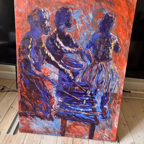 Maleri med figurativt motiv af to omfavnende personer. Billedet er udført i grønne, gule og hvide nuancer med dekorative mønstre i overfladen. Formatet er rektangulært og lodret. Velegnet som vægudsmykning i stue, gang eller andre opholdsrum.