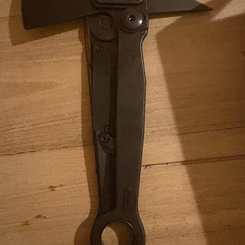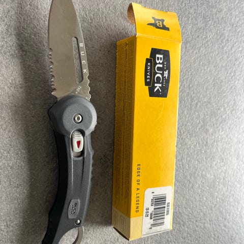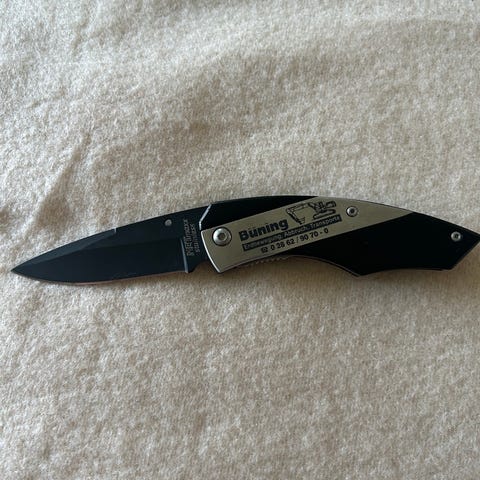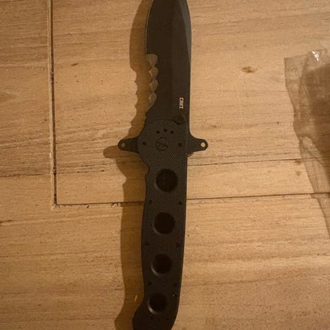 CRKT foldekniv i sort udførelse. Kniven har delvist savtakket klinge og ergonomisk skæfte med gennemgående huller. Udstyret med bælteclip på bagsiden og tommelknop for enhåndsbetjening. Leveres med original æske som vist på billederne. Helt ny aldrig brugt er åben for bud
