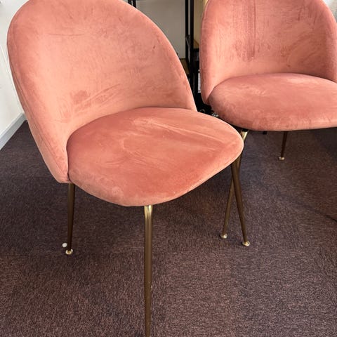 4 barstol i rosa velour med metalstel haves. Sædet har afrundet ryglæn og polstring i blødt velourstof. Stellet er i metal med gylden finish og har tværstænger, der fungerer som fodstøtte. Velegnet til brug ved højt bord eller køkkenbord