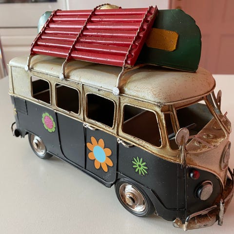 Ukendt mærke modelbil stationcar i metal i cremefarve med brune detaljer. Bilen har tagbagagebærer med to surfbrætter i forskellige farver monteret på taget. Velegnet som dekoration eller samlerobjekt. Døre og detaljer er udført i metal med malede ruder og lygter. Ikke særlige gammel fra dette årti