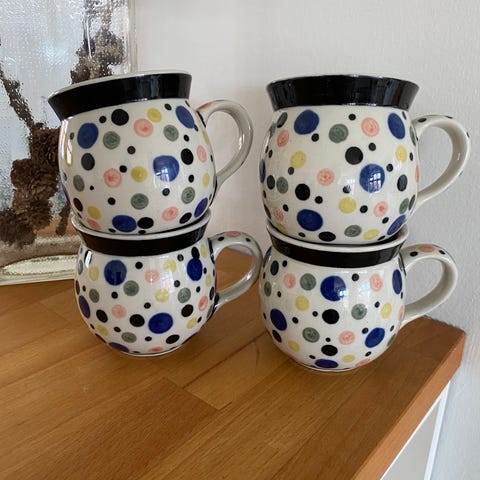 4 styk fine keramik krus / kopper i fine faver. De er vist nok købt i Bahne.