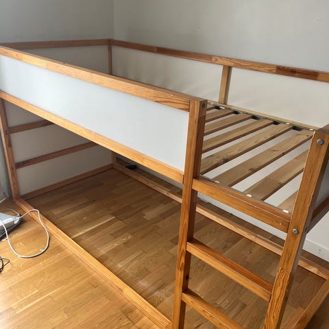 IKEA højseng til børn i træramme med integreret stige i gavlen. Sengen er egnet til børneværelset og giver mulighed for at udnytte pladsen under sengen til leg, opbevaring eller skrivebord. Enkelt, åbent design med lys træfarve og sider i lyst panel, der fungerer som sengehest for barnet.
