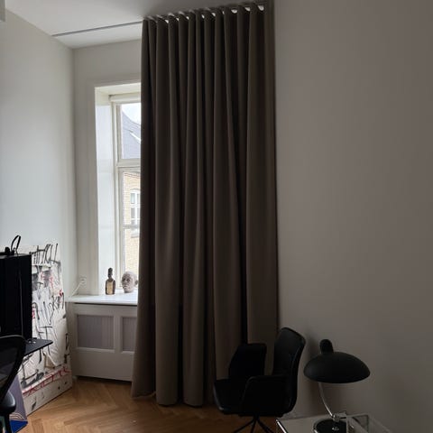 Mørklægnings gardiner i mørk beige nuance. Gardinerne er gulvlange og egner sig til montering ved høje vinduer som vist på billederne. Tekstilet fremstår ensfarvet og tungt faldende, velegnet til brug i soveværelse eller stue for afskærmning og dæmpning af lys.