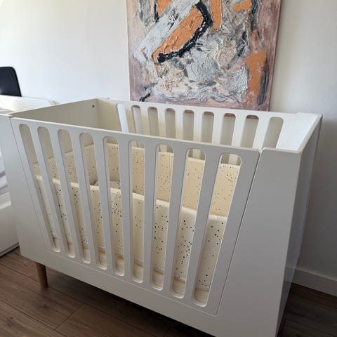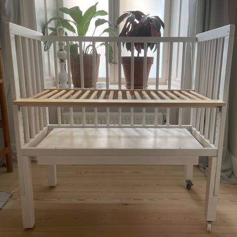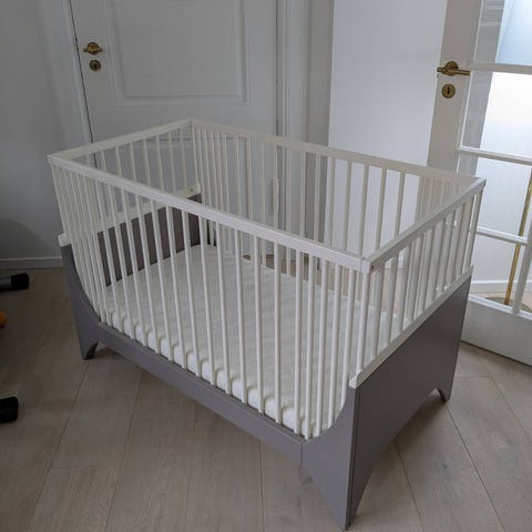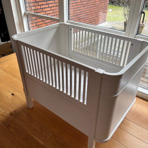 Tremmeseng i hvid. Sengen har tremmer hele vejen rundt og leveres med lamelbund/træbund med udskårne ventilationshuller. Egnet som babyseng eller juniorseng til mindre børn. Klassisk, enkel model i malet træ, der kan placeres op ad væg eller frit i rummet afhængigt af behov.