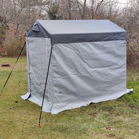 - Holdbar Konstruktion: Polyester materialet klarer al slags vejr uden at miste styrken eller følelsen. Det er forstærket med glasfiber, så teltet står solidt mod vind og stød. Selvom det er robust, har det en tekstureret overflade, der holder din cykel fri for ridser.