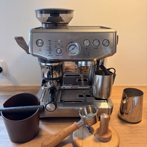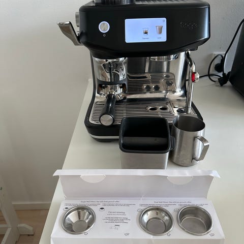 Står rigtig flot med få brugs ridser, nye serviceret og med flere nye dele så som rist til drypbakke, beholder til bønner m.m.