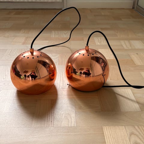 Sælger disse to flotte pendler fra danske Molly Marais Copenhagen (model LI610003). Lamperne har et fedt industrielt look i kobber-finish med sorte stofledninger, der passer perfekt over spisebordet eller køkkenøen.