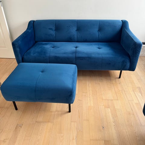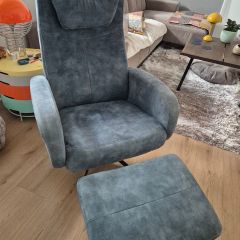 Sælger denne fine blå velour lænestol med fodskammel. Den er som ny og har ingen brugstegn, da den mest bare har stået til pynt. Kommer fra et dyr- og røgfrit hjem.