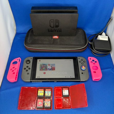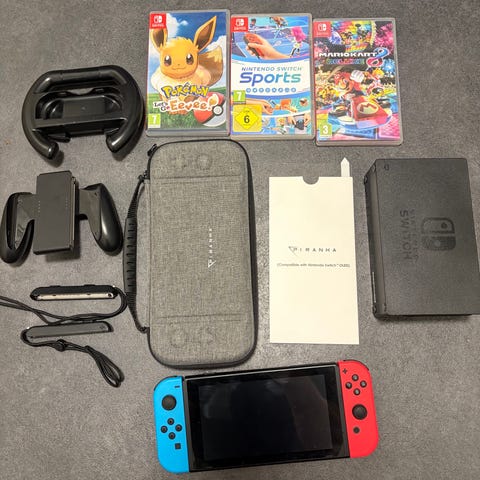 Nintendo Switch Pokémon Let’s Go Pikachu/Eevee konsol. Konsollen har specialdesign med Pikachu og Eevee på docken. Medfølgende tilbehør omfatter et sæt Joy-Con controllere i rød og blå, en Pro-lignende controller, en Poké Ball Plus controller samt en bæretaske til opbevaring og transport af konsol og tilbehør. Velegnet til brug både som håndholdt konsol og til spil på tv via docken. Og et sd jorr med 64 gb