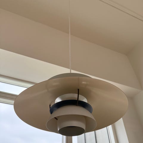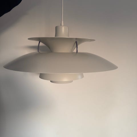 Louis Poulsen PH loftlampe designet af Poul Henningsen. Lampen er udført i hvidlakeret metal med den karakteristiske flerskærmskonstruktion, der giver et blændfrit og nedadrettet lys. Velegnet som belysning over spisebord eller i opholdsrum. Leveres som pendel med ledning til montering i loft.