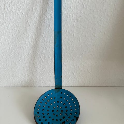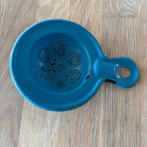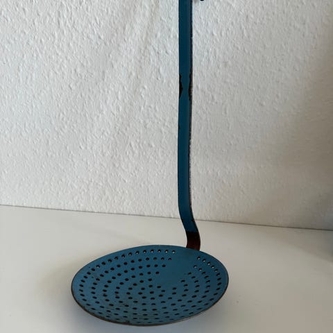Madam Blå dørsi med hank i metal. Yderside i blå farve og inderside i lys/cremefarve med cirkelmønster af små huller til afdrypning. Velegnet til at si eller dræne fx pasta, grøntsager eller bær direkte over vask eller skål. Langt håndtag med hul i enden gør det muligt at hænge sien på krog, når den ikke er i brug.