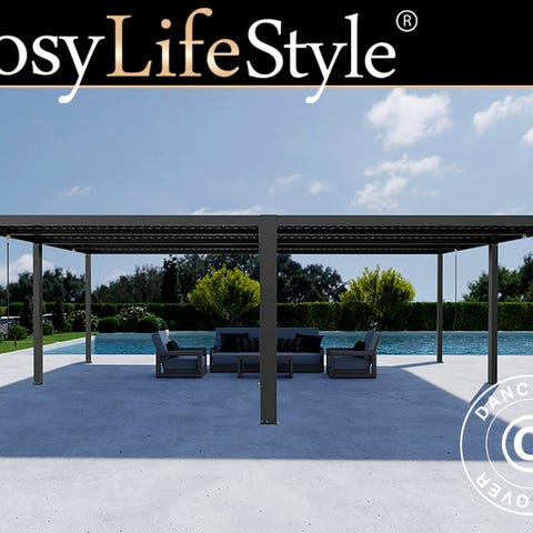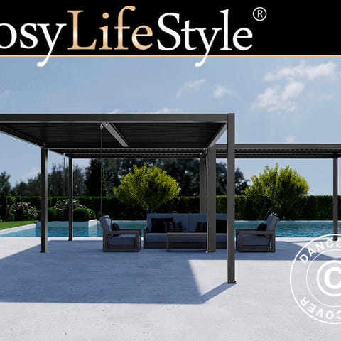 San Pablo er en moderne og elegant bioklimatisk pergola pavillon fremstillet i stærkt, vedligeholdelsesfrit pulverlakeret aluminium. De justerbare taglameller betjenes nemt med håndtag, så du kan regulere lysindfald, skygge og ventilation efter behov. Dette sæt indeholder fire komplette San Pablo pergola pavilloner, som leveres med solide beslag, så de kan sammenkobles sikkert til én større konstruktion. Hver pergola pavillon kan også anvendes separat. Sidevægge/skærme kan bestilles separat!