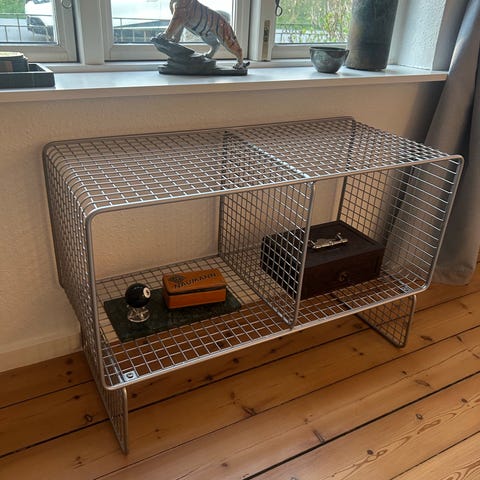 Montana Verner Panton reolmodul i metal i sølvfarve. Modul opbygget af parallelle metalstænger, der danner en åben kubeformet konstruktion. Kan anvendes enkeltvis eller stables til reolsystem til opbevaring eller udstilling af bøger og andre genstande. Velegnet til brug i stue, kontor eller entré som fleksibelt opbevaringsmøbel.