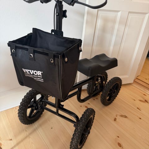 Ny og ubrugt VEVOR knæscooter med en kraftig kulstofstålramme, der kan bære op til 136 kg. Den er især velegnet til personer, der er ved at komme sig efter en brækket fod, ankel, benbrud, fodoperation eller ankeloperation.