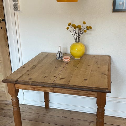 Originalt solidt gammelt svensk klapbord i oprindelig farve grå/grøn . 158 cm langt med begge klapper oppe. Virkeligt smukt. Købt lige før jeg flyttede i mindre lejlighed og øv der er ikke plads.