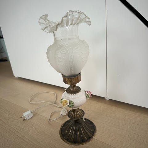 Jeg har denne porcelænsbordlampe i antik stil, med stor glaskuppel og messingmidte, samt firkantet, hvid, porcelænsfod dekoreret med blomstermotiver på alle sider.