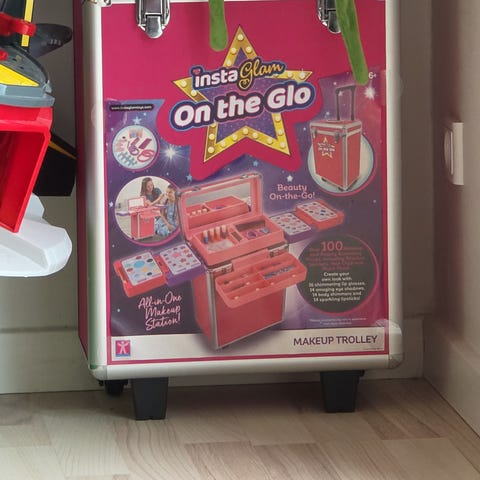 Shimmer and Sparkle Instaglam makeup-vogn, trækbar makeup-vogn, 100 dele inklusive trendy makeupfarver, neglelakker, applikatorer og hårtilbehør.